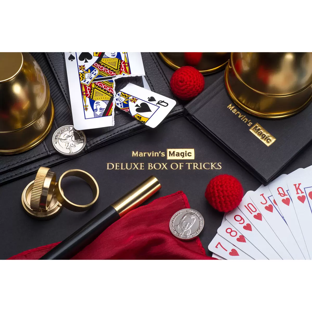 DISPLAYED IN A STUNNING BOX: The components of this set come in a beautifully presented double-layered black-and-gold box with red flock-fleeced interior to protect and add an extra luxury feel to the magic trick set. The box features all of Marvin’s most ingenious props including Svengali cards, dynamic coins, authentic himber wallet, magician’s silk, professional-sized magician’s cups and more. Look like a professional with this detailed magic set and use as a party piece at your gathering!