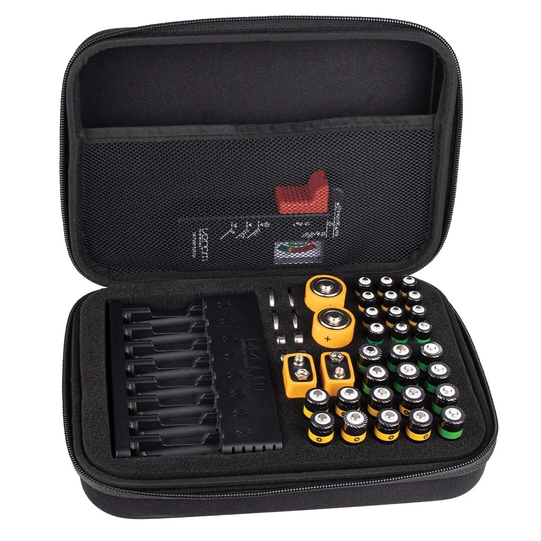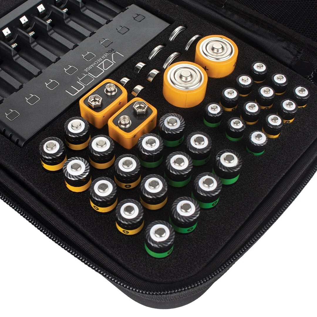 - Bespoke storage slots for up to 80 batteries including AA, AAA, C-Cell, D-Cell, 9V and button size